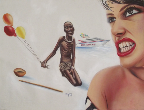 This painting address the moment of tension that is created when the Censor-Ship is passing through the real-life, trying to reproduce it with a few colorful balloons.
