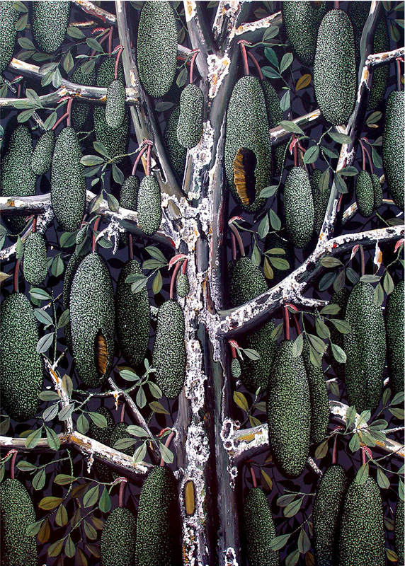 My paintings are often described as depicting a post-human landscape where traces of human activity and presence have almost been entirely lost in what has come about after. I live and work in Kerala and have been influenced heavily by the surroundings I have grown up in - I use the landscape and the elements around me to construct a psychological landscape. For me, landscape is filtered through personal and communal memory - of change, of time passing and of loss. These works often have a dark, desolate atmosphere to them but it is also important to look for signs of emerging life - a fish in the river perhaps or a bird appearing suddenly in the grove.