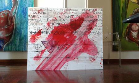 On the slab of travertine are engraved the words: intolerance, discrimination, homophobia, etc… on those