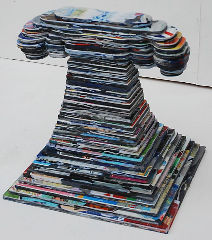 A stylized forties vintage telephone, which has now become an iconic collectors item. I made this piece from layers and layers of recycled kids mobiles. Looking at it closely it may be possible to see the sheets of plastic are actually compressed mobile phones. If not recycled this ewaste can cause health risks to workers and neighbouring residents and damage to the environment in countries which lack environmental regulations.