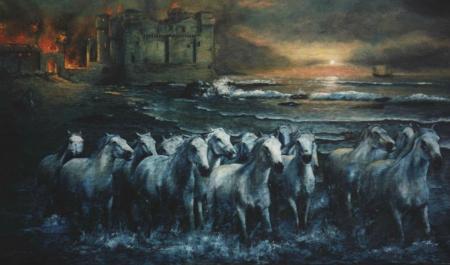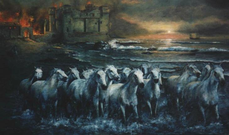 Oil painting on canvas. It portrays the Castle of Santa Severa (Rome) with the escape of white horses at a gallop. Large format 100 cm. x 180 cm. Framed. Wooden frame painted in blue.