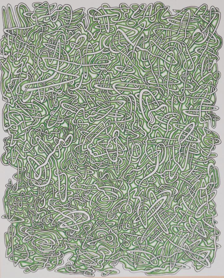 A small, interweaving mass accented with green.