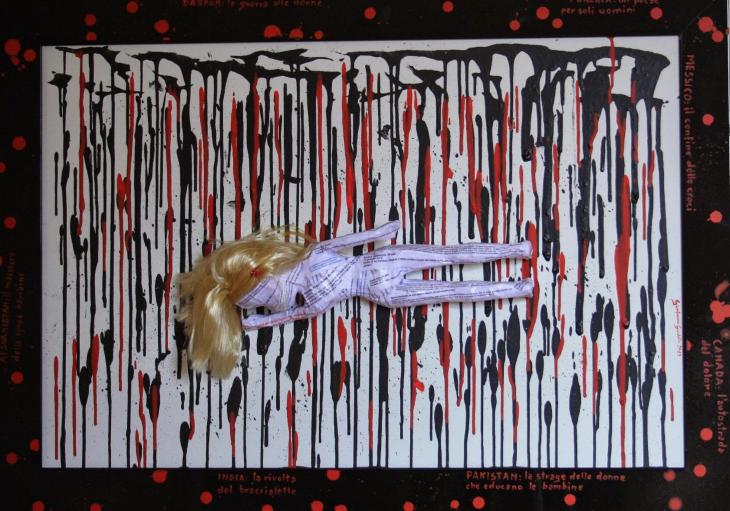 Il rosso e il nero che colano sullo sfondo stanno a significare il colore del sangue e della morte, tonalità sempre più presenti nella nostra società violenta e maschilista. In mezzo una bambola rivestita di articoli di gi...leggi tutto