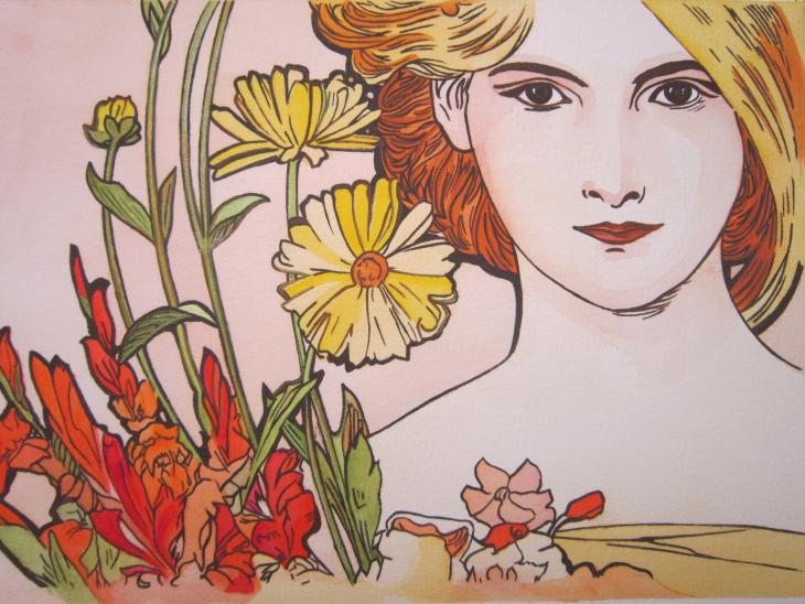 Acquerello in stile Art Nouveau dipinto a mano con colori ad acquerello e pastello su carta.