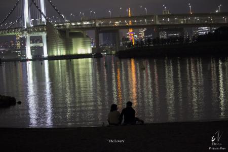 Due amanti sulla riva del Tokyo Rainbow Bridge, il loro amore è come lo specchio di luci che si riflettono di fronte a loro, puro. la foto ho scattato la foto nel momento in cui stavo percorrendo in notturna la riva, in una serata limpida dopo la pioggia del giorno. Dopo gli oltre 26 Km che abbiamo percorso in giornata.