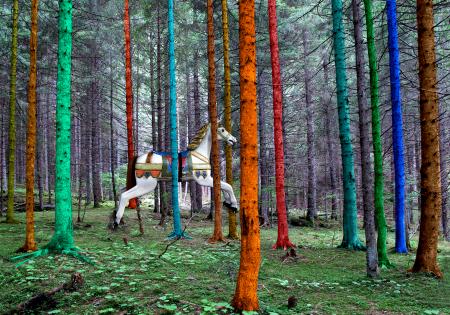 Dei tronchi rivestiti di chimere in una foresta che non si espone ai raggi del sole, sono attraversati dal cavallo di legno di una vecchia giostra, ma questo è precario e fuggevole come il creato.