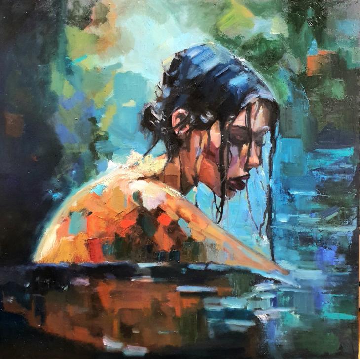 Questo dipinto ad olio, realizzato con pennelli e spatola, ritrae una giovane donna immersa nell'acqua, colta in un momento di profonda introspezione. La scena è pervasa d un’atmosfera contemplativa e malinconica, esaltata dalla palette cromatica intensa e contrastata. I toni caldi dell’incarnato e delle spalle, costruiti con spatolate materiche e vibranti arancioni e rossi, si fondono armoniosamente con i blu profondi e i verdi acquatici dello sfondo e della superficie riflettente.