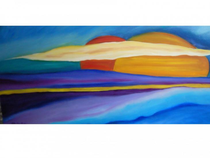 Orizzonte descive un tramonto dai forti valori cromatici, dalle campiture lisce e continue, un orizzonte di un'altra luna...